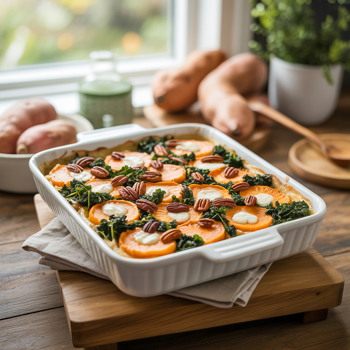 - Layers: 3 lb sweet potatoes (peeled, ⅛-inch slices), 4 cups chopped lacinato kale (ribs removed), 4 oz goat cheese (crumbled), 1 cup shredded Gruyère, 2 tbsp olive oil, ¾ tsp kosher salt, ½ tsp black pepper