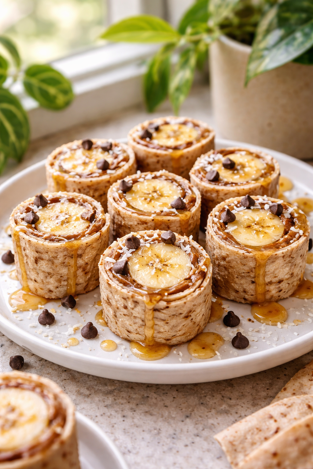 They look like sushi rolls but taste like a wholesome dessert snack—banana wrapped in a tortilla with almond butter, then sliced into little rounds. The name sticks because the presentation is weirdly satisfying and everyone loves a gimmick that tastes good.