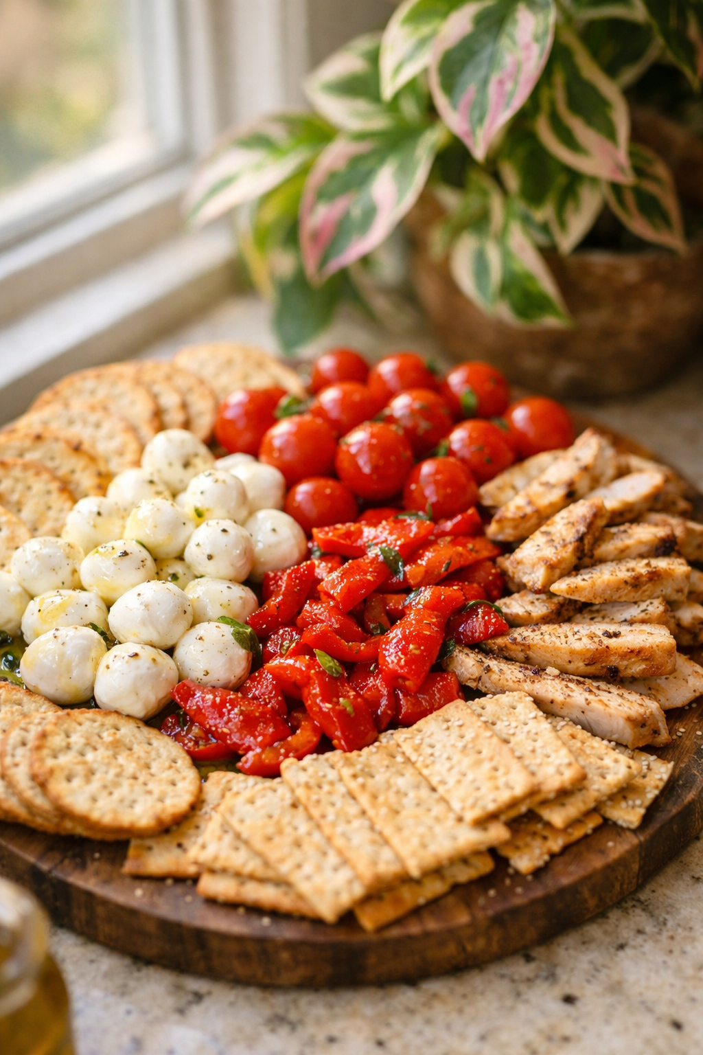 - Scatter mozzarella and tomatoes first so the board looks inviting immediately.