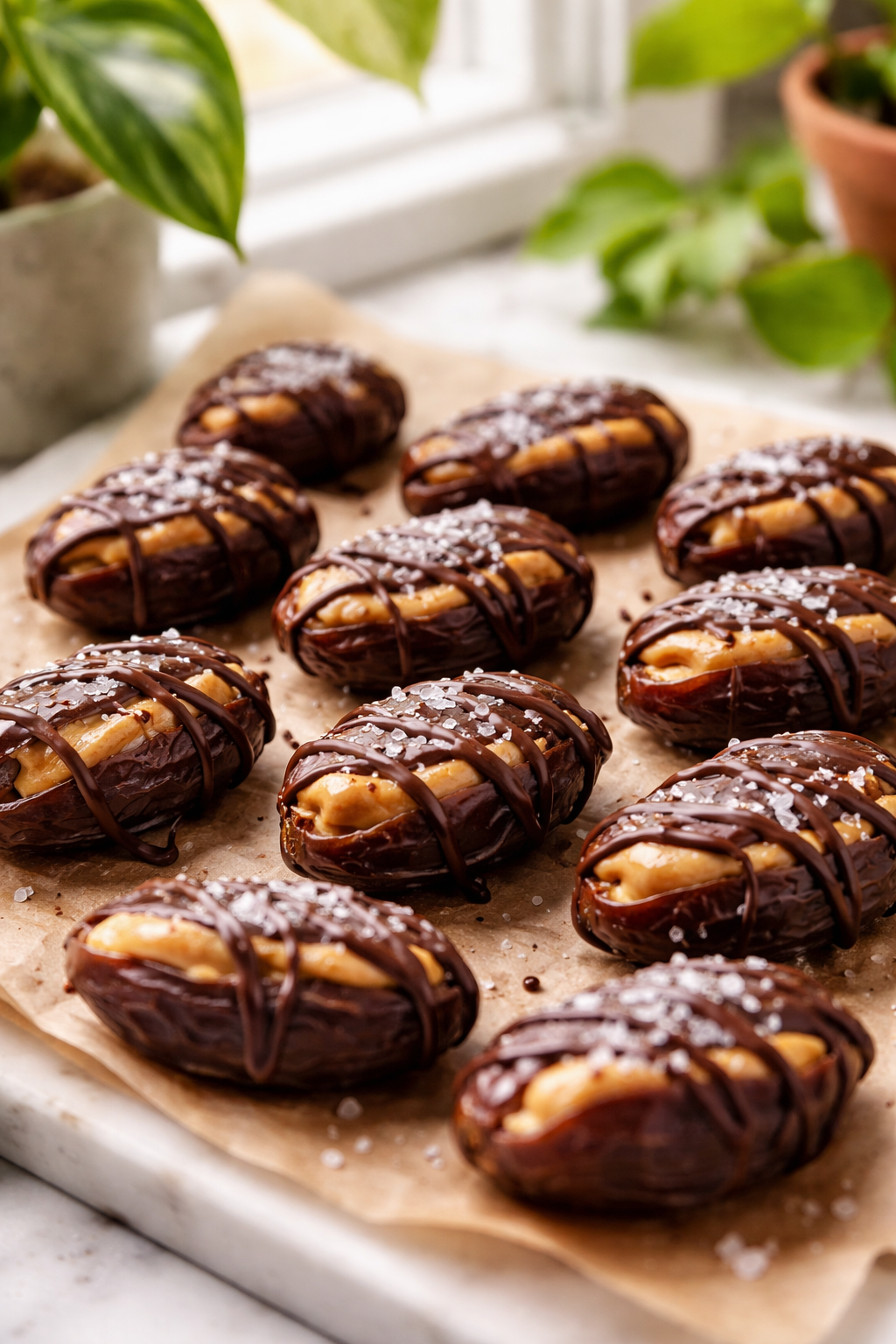 Slice each date open lengthwise and gently widen it without tearing. Spoon peanut butter generously into the center, smoothing it so the date closes neatly around the filling. Arrange the stuffed dates on parchment, then drizzle melted dark chocolate over the top in relaxed, uneven lines—this isn’t about perfection.