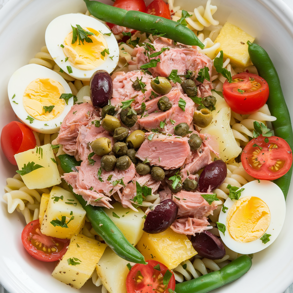 You taste: briny olives, lemony tuna, crisp green beans, little bites of potato—classic Niçoise energy, pasta-salad ease.