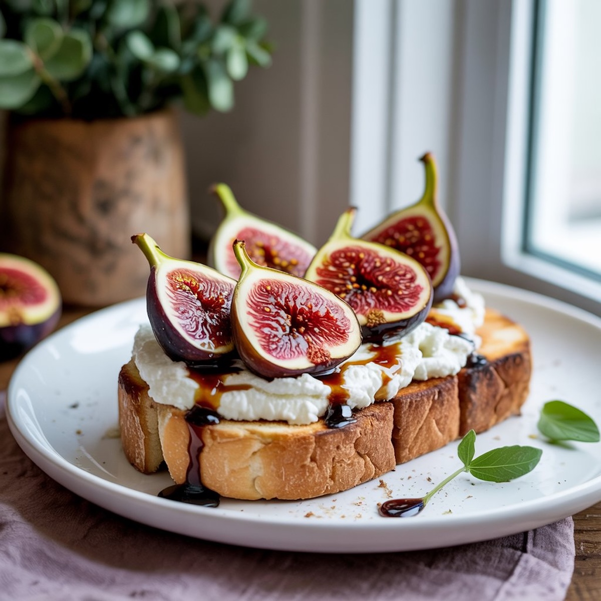 1) Savory Showstopper: Whipped Ricotta Toast with Honey-Roasted Figs + Balsamic Drizzle